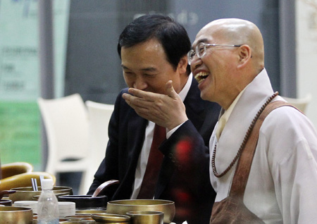 ©¹æ : ÀúÀÛ±Ç/¿¬ÇÕ´º½º ¹ý·û ½º´Ô°ú ÀÓÅÂÈñ Àü ´ëÅë·É½ÇÀåÀÌ 14ÀÏ Ã»¿Í´ë »ç¶ûä¿¡¼ ¿¸° '¹ý·û ½º´Ô û¿Í´ë ÅäÅ© ÄܼƮ'Çà»ç¿¡ ¾Õ¼ °°Àº Àå¼Ò¿¡ ÁغñµÈ ¸¸ÂùÀ» ÇÔ²² ÇÏ¸ç ¿ô°í ÀÖ´Ù. /¿¬ÇÕ´º½º