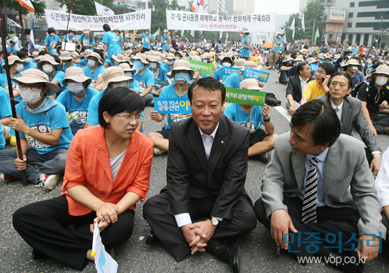 ´ë¿ Á¦ÀÏ ¾Õ¿¡´Â ÀÌÁ¤Èñ ¹ÎÁֳ뵿´ç ´ëÇ¥, Á¶½Â¼ö Áøº¸½Å´ç ´ëÇ¥, À¯½Ã¹Î ±¹¹ÎÂü¿©´ç ´ëÇ¥, ±è¿µÈÆ ¹ÎÁÖ³ëÃÑ À§¿øÀå, À̰½Ç Çѱ¹Áøº¸¿¬´ë ´ëÇ¥ µîÀÌ ¾É¾ÆÀÖ´Ù.
