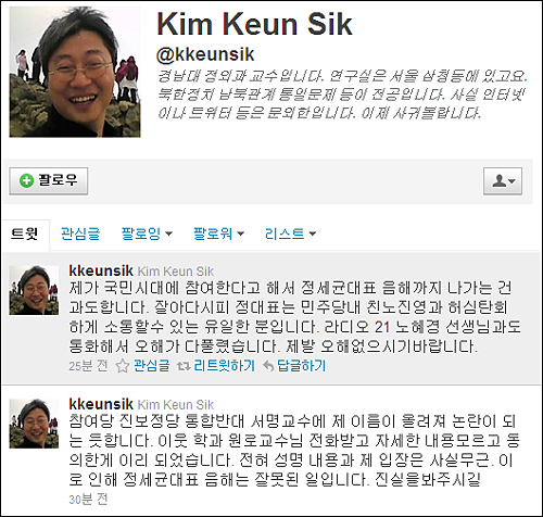 ±è ±³¼ö´Â ¡°³»°¡ ±¹¹Î½Ã´ë¿¡ Âü¿©ÇÑ´Ù°í ÇØ¼ Á¤¼¼±Õ Àü ´ëÇ¥ À½ÇرîÁö ³ª°¡´Â °Ç °úµµÇÏ´Ù¡±¸ç ¡°Àß ¾Æ´Ù½ÃÇÇ Á¤ Àü ´ëÇ¥´Â ¹ÎÁÖ´ç³» Ä£³ëÁø¿µ°ú Çã½ÉźȸÇÏ°Ô ¼ÒÅëÇÒ ¼ö ÀÖ´Â À¯ÀÏÇÑ ºÐÀÌ´Ù¡±°í ¸»Çß´Ù. ±è ±³¼ö´Â ¡°Á¦¹ß ¿ÀÇØ ¾øÀ¸½Ã±â¸¦ ¹Ù¶õ´Ù¡±°í ¸»Çß´Ù. ±×·¯³ª ±è ±³¼ö´Â Æ®À§Å͸¦ ÅëÇØ¼¸¸ °£´ÜÈ÷ ¾ð±ÞÇßÁö °ø½ÄÀûÀ¸·Î ÀÔÀå Ç¥¸í¿¡ ³ª¼Áö´Â ¾Ê¾Ò´Ù.