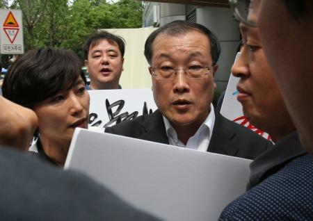 | ±èÀçö »çÀåÀÌ 1ÀÏ ¿ÀÈÄ ¹æ¹®Áø ÀÌ»çȸ¿¡¼ »çÀǸ¦ ¹øº¹ÇÑ µÚ ³ª¿À´Â °¡¿îµ¥, MBC³ëÁ¶ °ü°èÀÚµéÀÌ ±æÀ» ¸·°í »çÇ¥ Á¦Ãâ °æÀ§ µîÀ» µûÁ®¹¯°í ÀÖ´Ù.(MBC³ëÁ¶ Á¦°ø)