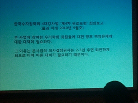 Çѱ¹¼öÀÚ¿øÇÐȸ 4´ë°»ç¾÷ "Á¦4Â÷ ¿ø·ÎÆ÷·³" ȸÀǺ¸°í (¹°°ú ¹Ì·¡ 2010³â 9¿ùÈ£)   "º» »ç¾÷¿¡ Âü¿©ÇÑ ¿ì¸®ÇÐȸ ȸ¿øµé¿¡ ´ëÇÑ ÇâÈÄ Ã¥ÀÓ¹®Á¦¿¡ ´ëÇÑ ´ëÃ¥ÀÌ ÇÊ¿äÇÏ´Ù.   ±× ÀÌÀ¯´Â º»»ç¾÷ÀÇ ÀÇ»ç°áÁ¤±ÇÀÚ´Â 2-3³â Èĸé ÅðÁøÇÏ°Ô  µÇ¹Ç·Î ÀÌ¿¡ µû¸¥ ´ëºñ°¡ ÇÊ¿äÇϱ⠶§¹®ÀÌ´Ù."