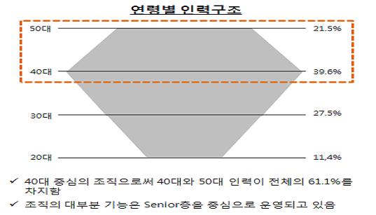 Á¶Á÷ÀÇ Æò±Õ ¿¬·É´ë°¡ 40´ë Áß¹ÝÀ̰í 15³â ÈÄ¿¡´Â ÇöÀç ÀηÂÁß 60% Á¤µµ°¡ ÅðÁ÷ÇÏ°Ô µÈ´Ù