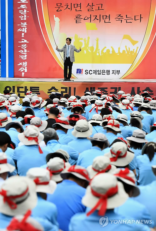 ÇöÀç SCÁ¦ÀÏÀºÇà ³ëµ¿Á¶ÇÕÀÇ ±èÀçÀ² À§¿øÀåÀ» ºñ·ÔÇÑ Á¶ÇÕ¿ø 500¿©¸íÀº ±¸Á¶Á¶Á¤À» À§ÇÑ ¼º°ú±ÞÁ¦ µî¿¡ ¹Ý´ëÇÏ¸ç ¼ÓÃÊ¿¡¼ 18Àϰ ÆÄ¾÷ÁßÀÌ´Ù.