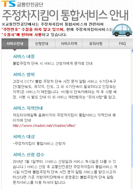 Ãʱ⿣ ¼ö¿ø½Ã¿¡ ÇÑÇØ¼¸¸ ½ÃÇàµÇ¾ú´Âµ¥ 2014³â 7¿ù ÀÌÈÄ °¢ Áö¹æÀÚÄ¡´Üü¿¡¼ ±³Åë¾ÈÀü°ø´Ü ÁÖÁ¤Â÷ÁöÅ´ÀÌ ÅëÇÕ¼ºñ½º ¾àÁ¤Ã¼°áÇÔ°ú µ¿½Ã¿¡ ÁøÇàÇÏ´Â ¼ºñ½º·Î ºÒ¹ý ÁÖÁ¤Â÷ ´Ü¼Ó½Ã ¼ºñ½º ½ÅûÀÚ¿¡°Ô ¹®ÀÚ·Î ´Ü¼Ó ¾Ë¸²À» ÇØÁÖ´Â ¼ºñ½º.