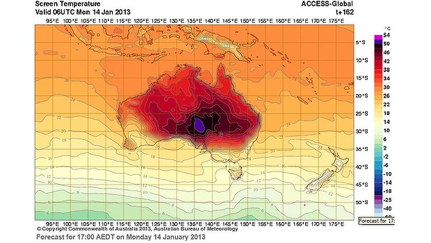 ÇÑÆí È£ÁÖ ±â»óûÀº ´ÙÀ½ ÁÖ ³¯¾¾¸¦ ¿¹º¸ÇÏ¸é¼ ±âÁ¸ ±â¿Â ¿¹º¸ÆÇ¿¡ »õ·Î¿î Ä÷¯¸¦ Ãß°¡ÇÒ ¼ö ¹Û¿¡ ¾ø¾ú´Ù. È£ÁÖ Á߽ɺΠ¹Ù·Î ¾Æ·¡ÂÊ ³¯¾¾°¡ 54µµ±îÁö ¿À¸¦ °ÍÀ¸·Î ¿¹»óµÇ´Âµ¥ ±âÁ¸ ±â¿Â ¿¹º¸ÆÇ »ö±ò·Î´Â 50µµ±îÁö¸¸ Ç¥±âÇÒ ¼ö Àֱ⠶§¹®ÀÌ´Ù. Áö±Ý±îÁö È£ÁÖ¿¡¼ ±â·ÏµÈ ÃÖ°í ±â¿ÂÀº Áö³ 1960³â 1¿ù 2ÀÏ Oodnadatta °øÇ׿¡¼ ±â·ÏµÈ 50.7µµ¶ó°í ±â»óû °ü°èÀÚ´Â ¹àÇû´Ù.