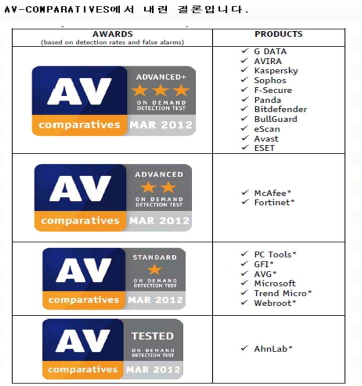 Àü¼¼°è ¹é½Å ÇÁ·Î±×·¥À» Æò°¡ÇÏ´Â ¾÷ü Áß¿¡ AV-Comparatives¶ó´Â ȸ»ç°¡ ÀÖ´Ù. ÀÏÁ¤ÇÑ ±â°£¸¶´Ù Æò°¡ÇÏ°í °á°ú¸¦ ¿Ã¸®´Â ¸ð¾çÀε¥ Áö³ 2012³â 3¿ù¿¡ Å×½ºÆ®ÇÑ °á°ú¸¦ ¿Ã·È´Ù.
