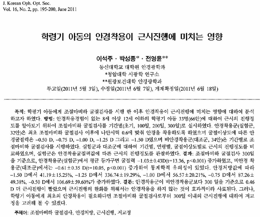 [ºÀÆÈ´åÄÄ ´Üµ¶ ±â»ç] ÃʵîÇб³ ÀúÇг⠽ñ⿡ ¾È°æÀ» Âø¿ëÇϱ⠽ÃÀÛÇÏ´Â ¾ÆÀ̵éÀÌ ´Ã¾î³ª°í ÀÖ´Ù. ¹°·Ð ¾È°æÀ» ¾´´Ù°í ÇØµµ ±Ù½Ã°¡ ÁøÇàµÇ´Â °ÍÀº ´Ùµé ¾Ë°í ÀÖÁö¸¸ ±Ù½Ã ÁøÇàÀ» ´ÊÃá´Ù°í ¿©°ÜÁö°í ÀÖ´Ù. ±×·¯³ª ¾È°æ Âø¿ëÀÌ ¿ÀÈ÷·Á ±Ù½Ã ÁøÇàÀ» ºü¸£°Ô ÇÑ´Ù´Â ¿¬±¸ °á°ú°¡ ³ª¿Ô´Ù. À̼®ÁÖ(µ¿½Å´ëÇб³ ¾È°æ±¤Çаú), ¹Ú¼ºÁ¾(û¾Ï´ëÇÐ ½Ã±¤ÇÐ ¿¬±¸¼Ò), Àü¿µÀ±(¿ø±¤º¸°Ç´ëÇÐ ¾È°æ±¤Çаú) ¿¬±¸ÆÀÀº Çѱ¹¾È±¤ÇÐȸ¿¡¼ ¹ßÇàÇÏ´Â '¾È±¤ÇÐȸÁö' 16±Ç 2È£(2011)¿¡ 'Çзɱ⠾Ƶ¿ÀÇ ¾È°æÂø¿ëÀÌ ±Ù½ÃÁøÇà¿¡ ¹ÌÄ¡´Â ¿µÇâ'À̶ó´Â ³í¹®À» ÅëÇØ ÀÌ¿Í °°Àº ÁÖÀåÀ» Çß´Ù. ÀÌ¿¡ µû¸£¸é ¾È°æÀ» óÀ½ ¾²±â ½ÃÀÛÇÑ 8¼¼ ÀÌ»ó 12¼¼ ÀÌÇÏ Çзɱ⠾Ƶ¿ 16¸í(32¾È)°ú °°Àº Á¤µµ·Î ´«ÀÌ ³ª»ÚÁö¸¸ ¾È°æÀ» ¾²Áö ¾ÊÀº ´ëÁ¶±º ¾Æµ¿ 17¸í(34¾È)¿¡ ´ëÇØ Ãʱâ, 100ÀÏ, 200ÀÏ, 300ÀÏ ´ÜÀ§·Î °Ë»ç¸¦ ÇÑ °á°ú 300ÀÏ ÈÄ¿¡´Â Åë°èÇÐÀûÀ¸·Î À¯ÀÇÇÏ°Ô ¾È°æÂø¿ë±ºÀÌ ºñÂø¿ë±ºº¸´Ù 0.46D ±Ù½Ã ÁøÇàÀÌ ´õ »¡¶ú´Ù°í ÇÑ´Ù. ÀúÀÚµéÀº "Ãʱ⠱ٽÿ¡ ´ëÇÏ¿© ¾È°æ Âø¿ëÀ» ÀÚÁ¦ÇÏ´Â °ÍÀÌ ±Ù½ÃÁøÇà¾ïÁ¦¿¡ µµ¿òÀ» ÁÙ °ÍÀ¸·Î »ç·áµÈ´Ù. ÀÌ¿¡ ´ëÇÑ ´ë¾ÈÀ¸·Î, ¿Ã¹Ù¸¥ µ¶¼°Å¸® ¹× ¿Ã¹Ù¸¥ TV½Ãû°Å¸®¸¦ ÁöµµÇÏ°í Æí½ÄÇÏÁö ¾Ê´Â °ÍÀÌ ±Ù½ÃÁøÇàÀ» ¿ÏÈÇÒ °ÍÀ̶ó »ý°¢µÈ´Ù"°í °á·ÐÀ» ³»·È´Ù. Çзɱâ Àڳฦ µÐ Çкθð´Â Àڳడ ´«ÀÌ ³ª»Ú´Ù°í ¹«Á¶°Ç ¾È°æÀ» ¸ÂÃçÁÖ¾î¾ß ÇÒÁö Çѹø »ý°¢ÇØ º¼ ÀÏÀÌ´Ù. ³í¹®Ãâó