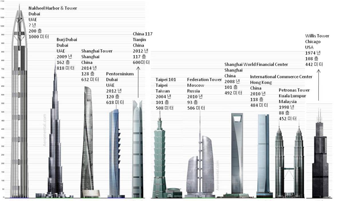 Burj Dubai´Â 2010 ³â °³ÀåµÈ »ç¶÷ÀÌ ¸¸µç °¡Àå ³ôÀº ÇöÁ¸ °ÇÃ๰ÀÌ´Ù. (À§ ±×¸² ¿ÞÂÊ¿¡¼ µÎ¹øÂ° °Ç¹°) ¿µ±¤µµ Àá½Ã µÎ¹ÙÀÌÀÇ ¸ô¶ô°ú ÇÔ²² ¼ÒÀ¯±ÇÀÌ ¾Æ¶ø¿¡¹Ì·¹ÀÌÆ®¿¬ÇÕ¿¡ ³Ñ¾î°¡°í, UAE ´ëÅë·É Sheik Khalifa bin Zayed al-NahyanÀÇ À̸§À» µû Burj Khalifa·Î °³¸íµÇ¾ú´Ù.