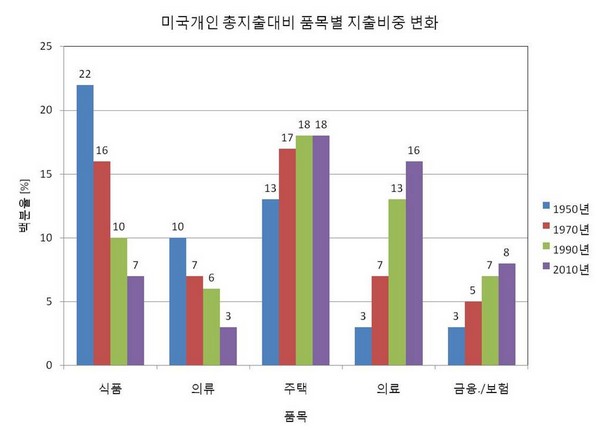 Áö³ 60 ³â°£ ¹Ì±¹°³ÀÎ ÃÑÁöÃâ´ëºñ ½Äǰ/ÀÇ·ùºñ ÁöÃâ ºñÁßÀº ²ÙÁØÈ÷ ÁÙ¾ú°í, ÁÖÅÃ/ÀÇ·á/±ÝÀ¶º¸Çè ÁöÃâ ºñÁßÀº ²ÙÁØÈ÷ ´Ã¾ú´Ù.