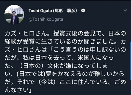 À§ÀÇ Â©¹æ¹ø¿ª: Ä«Áî È÷·Î¾¾. ¼ö»ó½ÄÈÄÀÇ ±âÀÚȸ°ß¿¡¼, "ÀϺ»¿¡¼ÀÇ °æÇèÀÌ ¼ö»ó¿¡ µµ¿òÀÌ µÆ½À´Ï±î?"¶ó°í ³»°¡ ¹°¾î ºÃ´Âµ¥, Ä«ÁîÈ÷·Î¾¾´Â "ÀÌ·¸°Ô ¸»ÇÏ´Â°Ô ¹Ì¾ÈÇѵ¥, ³ª´Â ÀϺ»À» ¶°³ª ¹Ì±¹ÀÎÀÌ µÆ´Ù. (ÀϺ»ÀÇ) ¹®È°¡ ½È¾îÁ³´Âµ¥ (ÀϺ»¿¡¼´Â) ²ÞÀ» ÀÌ·ç±â ¾î·Æ±â ¶§¹®ÀÌ´Ù. ±×·¡¼ (Áö±ÝÀº) ¿©±â¿¡(¹Ì±¹¿¡) »ì°í ÀÖ´Ù. ¹Ì¾ÈÇÏ´Ù"....¶ó°í, ¿µ¾î·Î ´ë´äÇß´Ù°í ÇÑ´Ù.