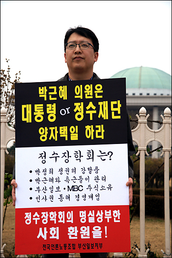 ÀÌÈ£Áø Àü±¹¾ð·Ð³ëµ¿Á¶ÇÕ ºÎ»êÀϺ¸ÁöºÎÀåÀº Áö³­ 11¿ù 17ÀÏ ±¹È¸ÀÇ»ç´ç ¾Õ¿¡¼­ "´ëÅë·ÉÀÌ³Ä Á¤¼öÀç´ÜÀ̳Ä. ¹Ú±ÙÇý ÀÇ¿øÀº ¼±ÅÃÇ϶ó"´Â ³»¿ëÀ¸·Î 1ÀνÃÀ§¸¦ ¹ú¿´´Ù.¨Ï ¾ð·Ð³ëÁ¶ ºÎ»êÀϺ¸ÁöºÎ
